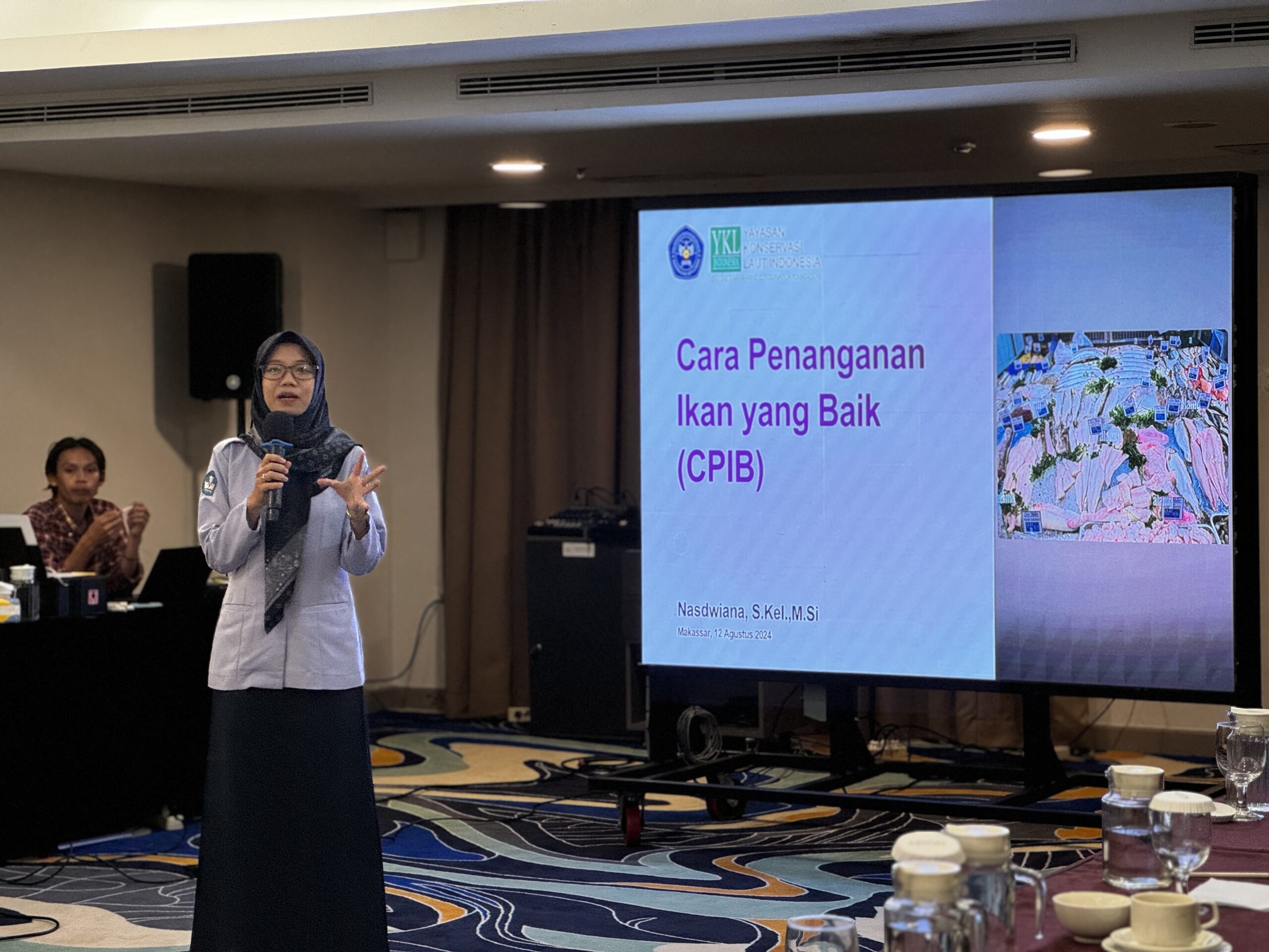 Materi pertama disampaikan oleh Sry Rahayu Setyaningsih dari Badan Pengendalian dan Pengawasan Mutu Hasil Kelautan dan Perikanan (BPPMHKP) Makassar, Kementerian Kelautan dan Perikanan. Ia memaparkan kebijakan sertifikasi CPIB di tingkat supplier serta pentingnya jaminan mutu dalam perdagangan perikanan.